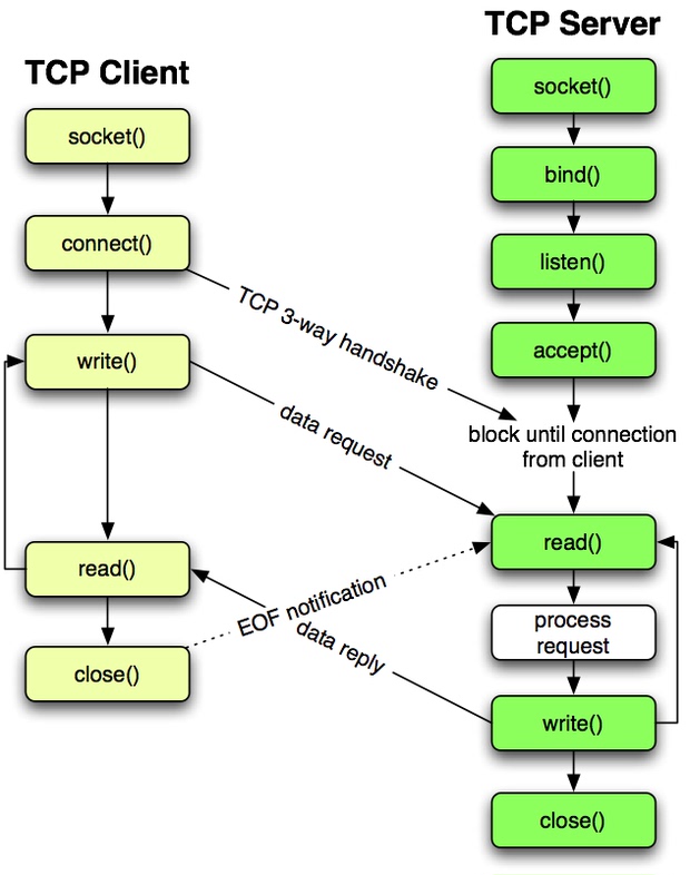 TCP socket 由于在通信前需要建立连接,所以其模式较 UDP socket 复杂些。具体如下: