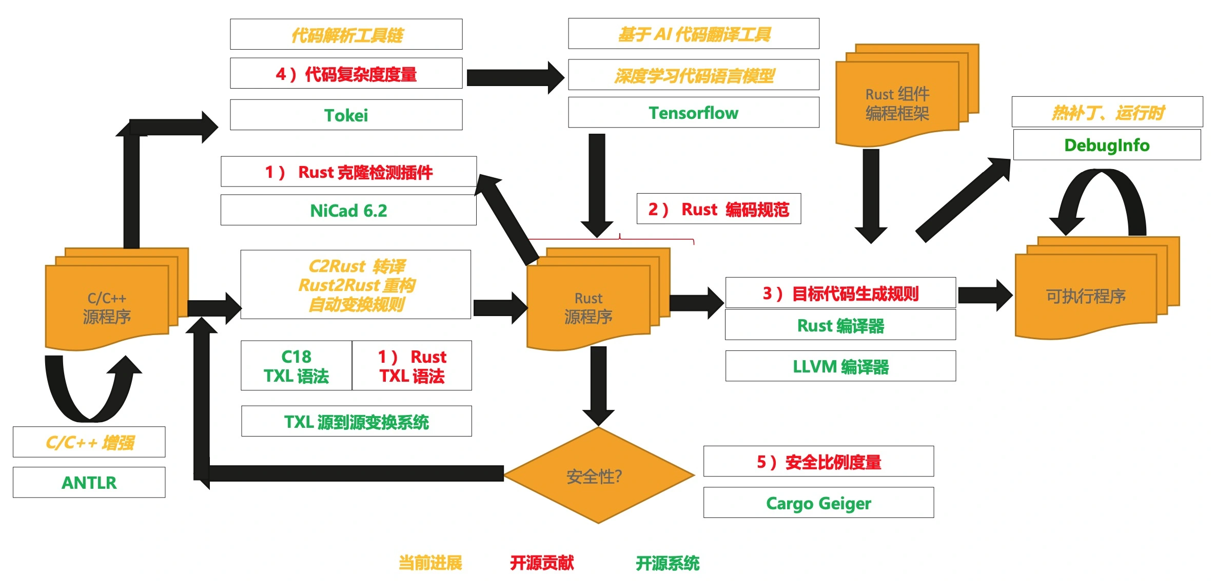 该讲师从宏观角度谈了华为对 Rust 的探索,包括:代码自动生成、支持 AArch64 指令集,在 Rust 社区方面,起草相关编码规范,安全代码度量工具 geiger 等。