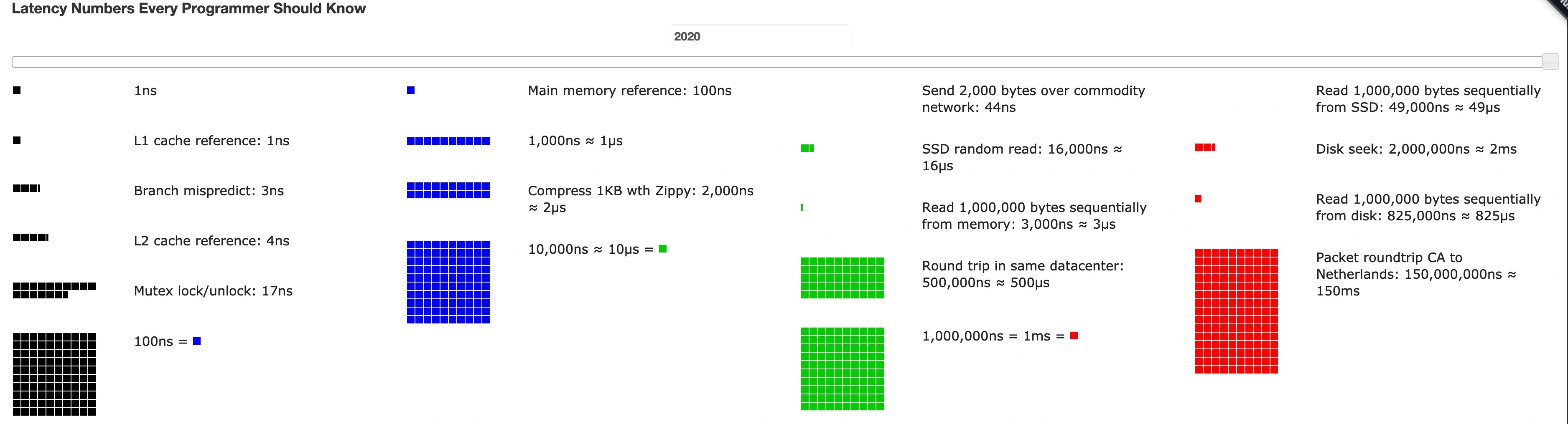 DatenLord 是此次大会最为“硬”核的分享。DatenLord 和 TensorBase 的出发点类似,一开始都讲述了现代硬件性能已经越来越强劲,Linux 内核中的模块已经无法充分利用硬件性能,通过在用户态编写存储来绕过内核。这里有必要贴一下 Google 大神 Jeff Dean 提出的 Numbers Everyone Should Know,不过随着时间推移,这里面的数字可能已经不准确,因此有人制作了不同年份的可视化网站来展示: