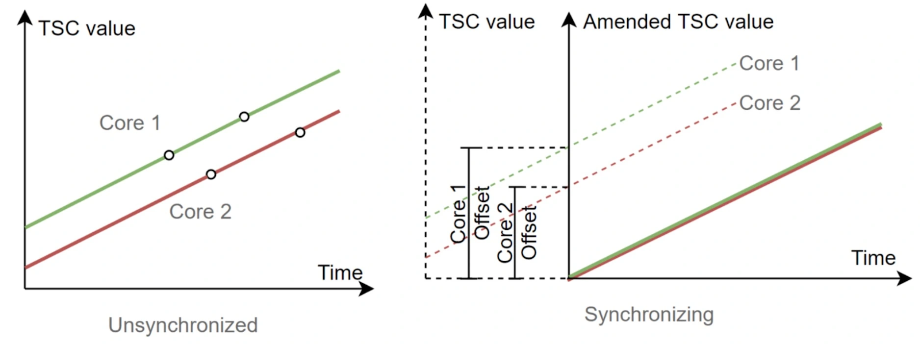 的开销(25ns),直接调用 TSC 指令(x86 架构下,单次耗时 5ns) - 通过绑线程(sched_setaffinity)的方式,同步多线程的时间获取